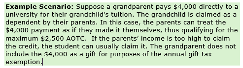 - Family members pay the tuition directly: The IRS allows the expenses to be treated as though the student paid them. If the student is claimed as a dependent by the parents, the parents can subsequently include these payments as qualifying expenses for the AOTC on their tax return. This effectively allows the parent’s household to benefit from the contribution without relinquishing the tax credit: